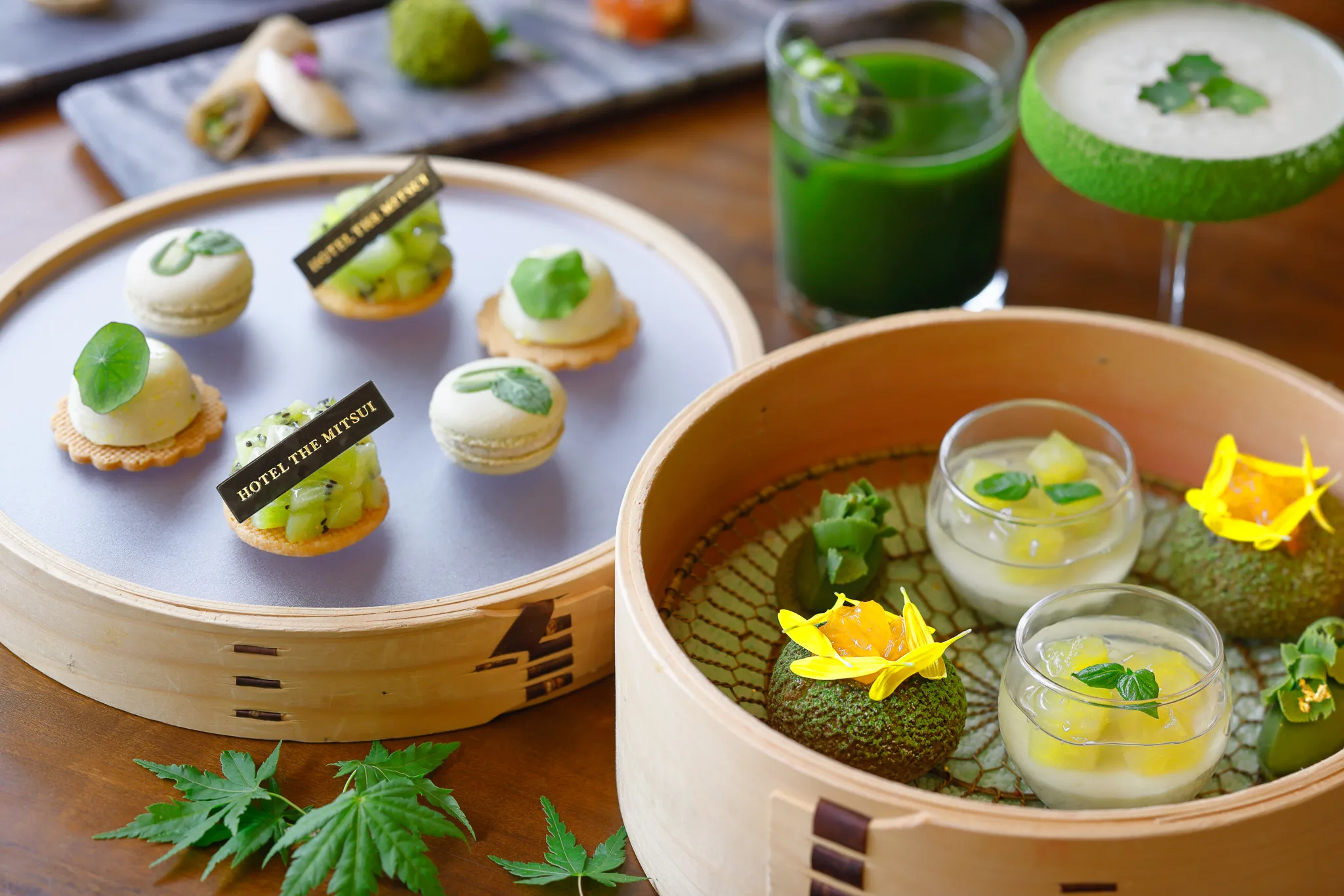 旬のメロンや抹茶を用いて爽やかなグリーンを際立たせたスイーツをはじめ、初夏の色彩を散りばめたセイボリーなど、瑞々しい味わいをご賞味ください。また、ウェルカムティーには創業150年の老舗茶舗「柳桜園」の玉露をご用意。茶筒や茶碗といった京都が誇る伝統工藝品の数々に触れながら、心満たされる一杯をご堪能ください。