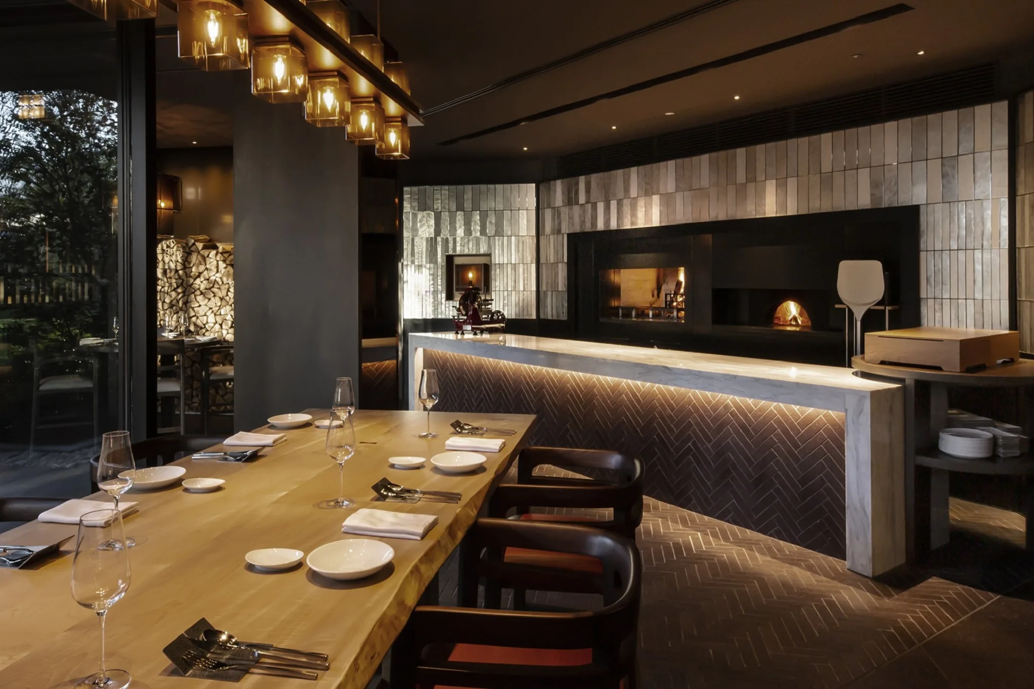 店内中央にあるピザ窯の炎が揺らめく特等席にて、香ばしい香りと共に焼き上がるシェフお任せのピッツァを、スパークリングワインやビールと共にスタンディングスタイルでお愉しみいただけます。チェックイン後のリフレッシュや、ディナー前の軽い1杯として、お気軽にご利用ください。
